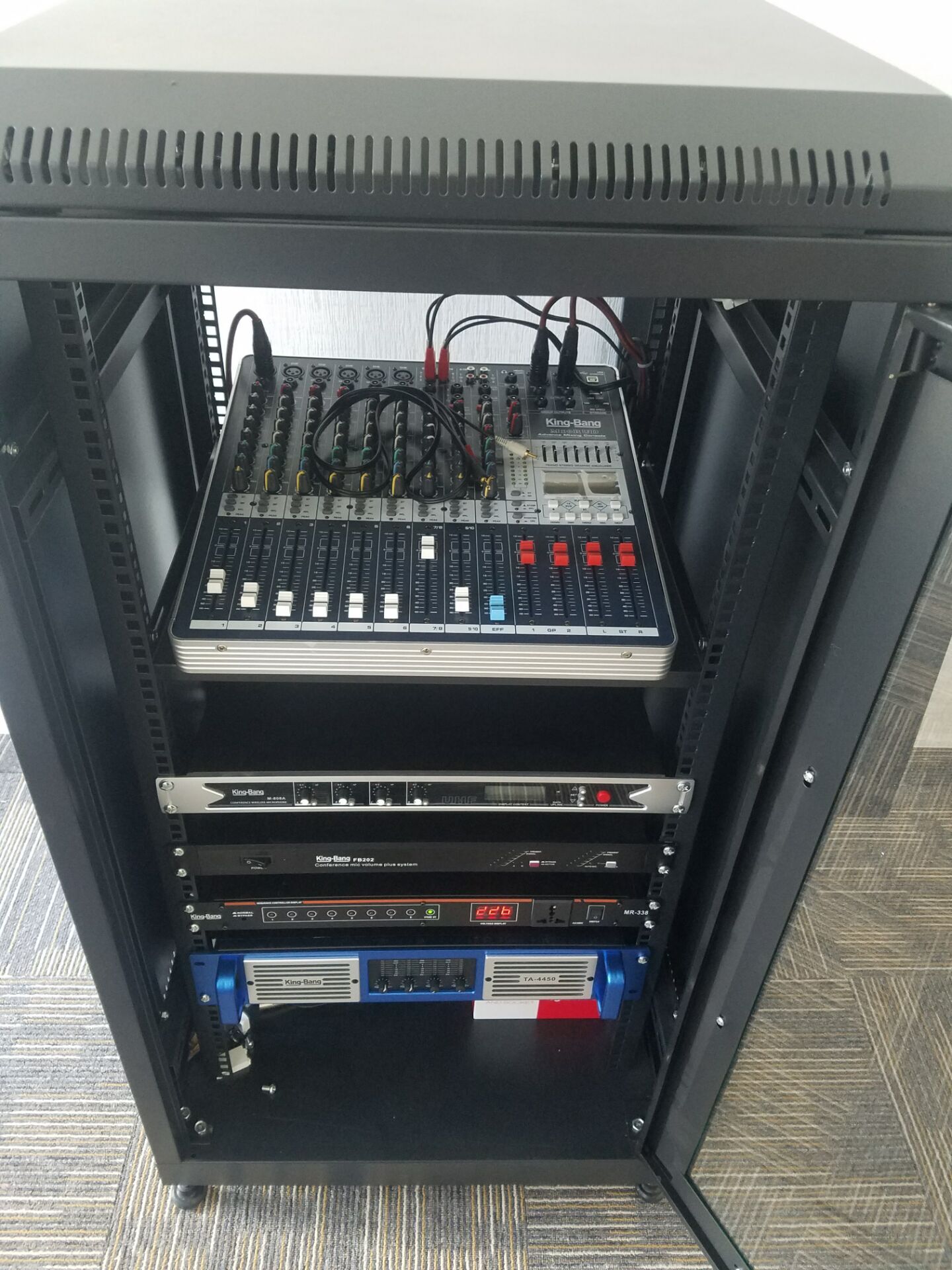 音頻環境的建立離不開電聲設備,它由以下四個部分組成:聲源設備——指拾音設備、影音信號播放設備如:拾音話筒、CD、MD、DAT、DVD等設備;調控設備——指對聲源設備送出的音頻信號等多路的音頻信號進行前級的放大和混音輸出、音頻信號處理的設備,如:調音臺、