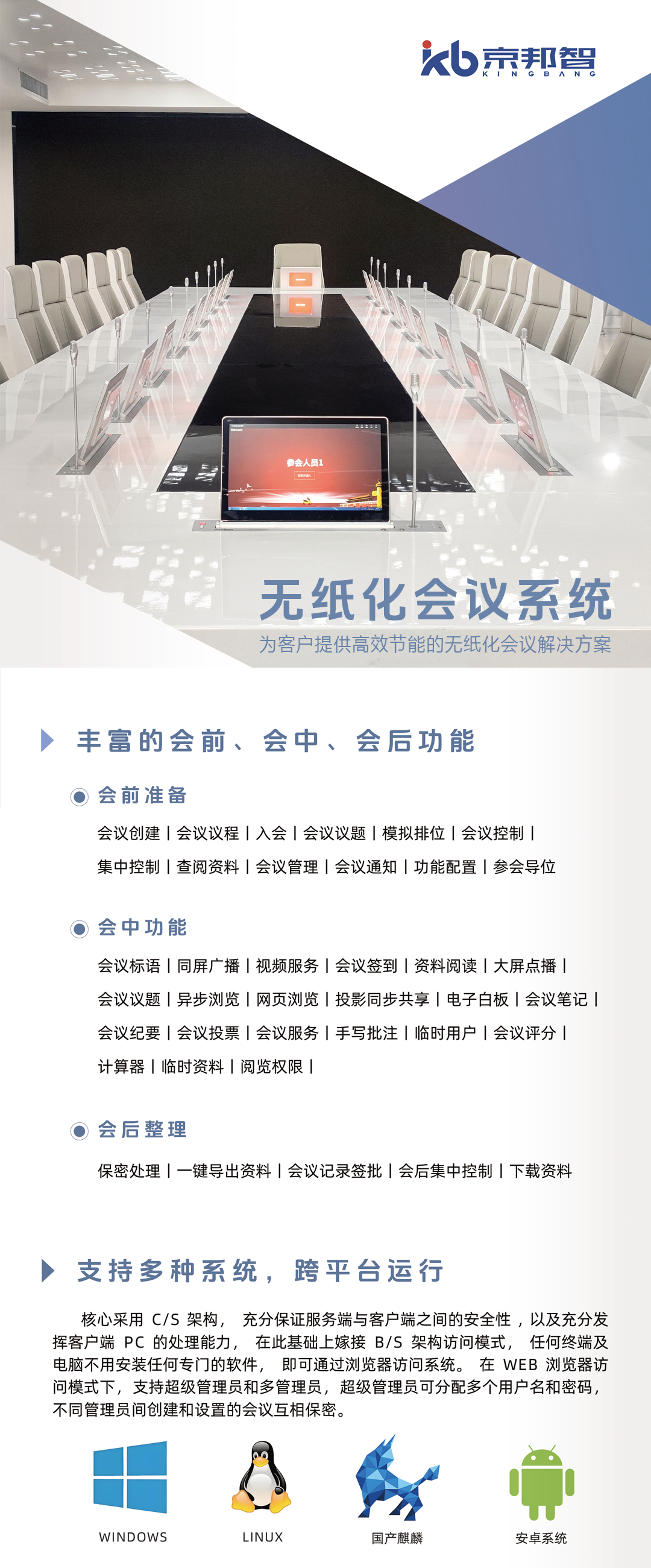 無紙化會議系統可以無縫對接數字會議系統、業務系統、辦公OA系統、中控系統、云會議預約系統、庭審系統、綜合管理平臺等,實現統一管控,互聯互通。無紙化會議系統具有高度保密、電子存檔、穩定可靠等特性,提供會前準備、會中功能、會后整理等多種高效功能,如會議討論、投票表決、會議紀要、文件共享、文件會簽、會議服務等。在顯示終端方面,各種尺寸以及類型均可自由選擇,滿足各種場景需求。